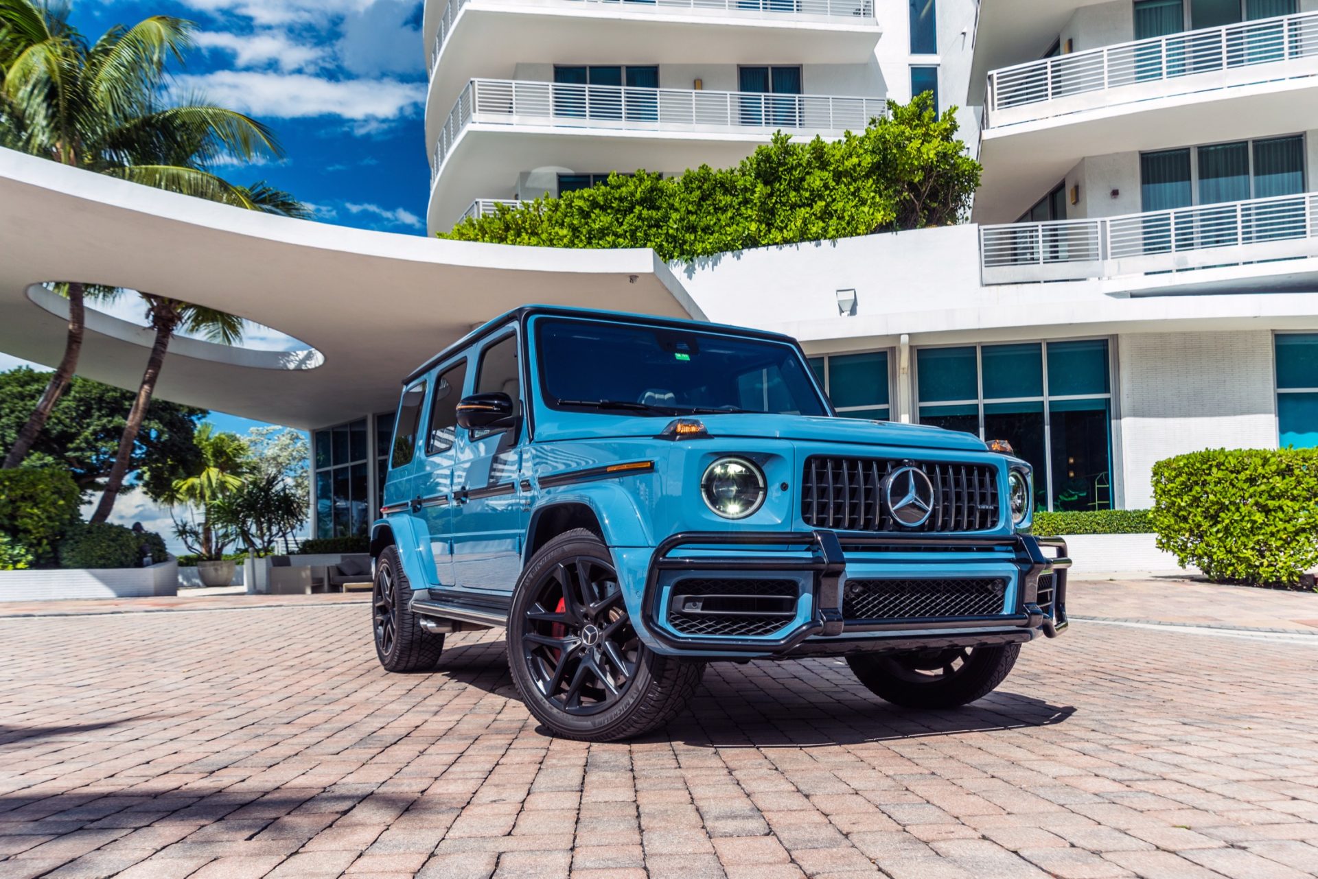 Mercedes Benz G63 AMG Blue front right available for rent on Miami Beach hotels by Rent & Paradise Exotic & Luxury Car Rental