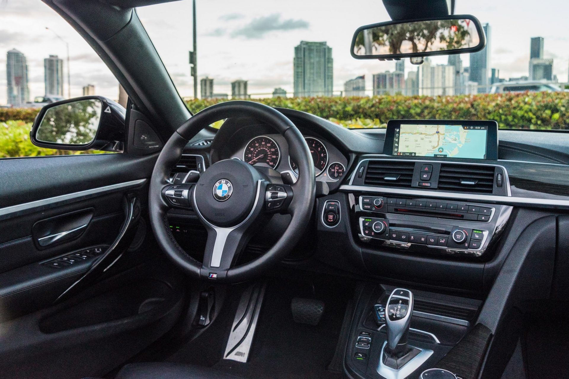 white bmw 440i center console of rental car