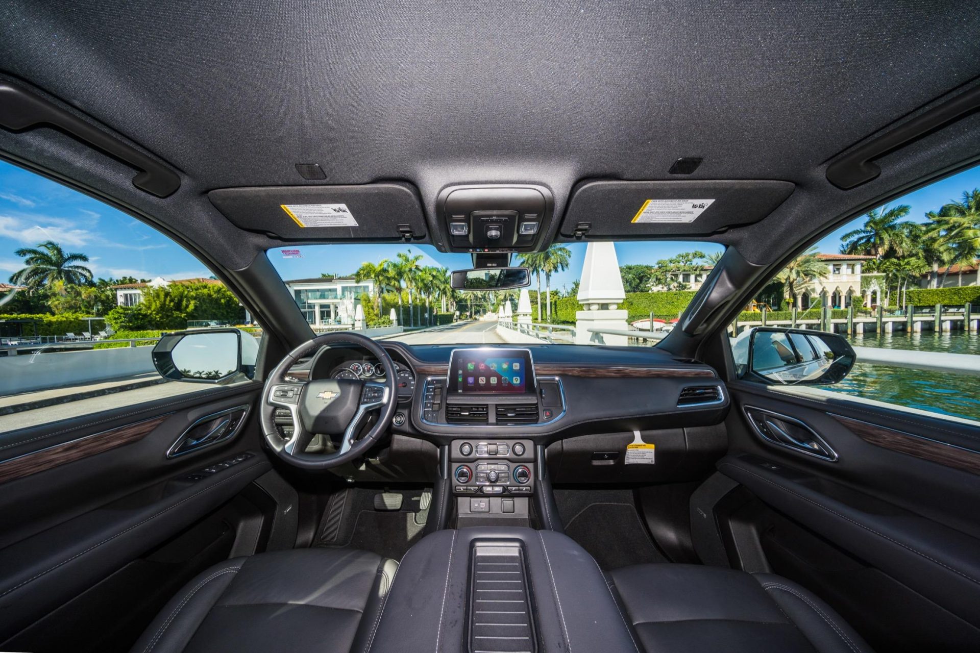 white chevy suburban black leather front interior apple carplay