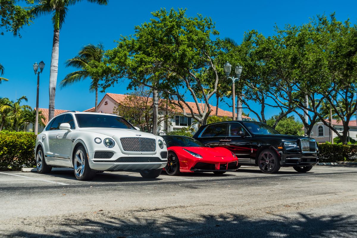 red ferrari black rolls royce cullinan side view three cars