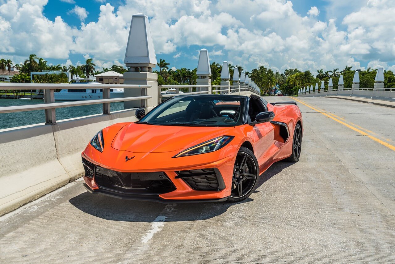 front view of orange corvette c8 rental in Miami