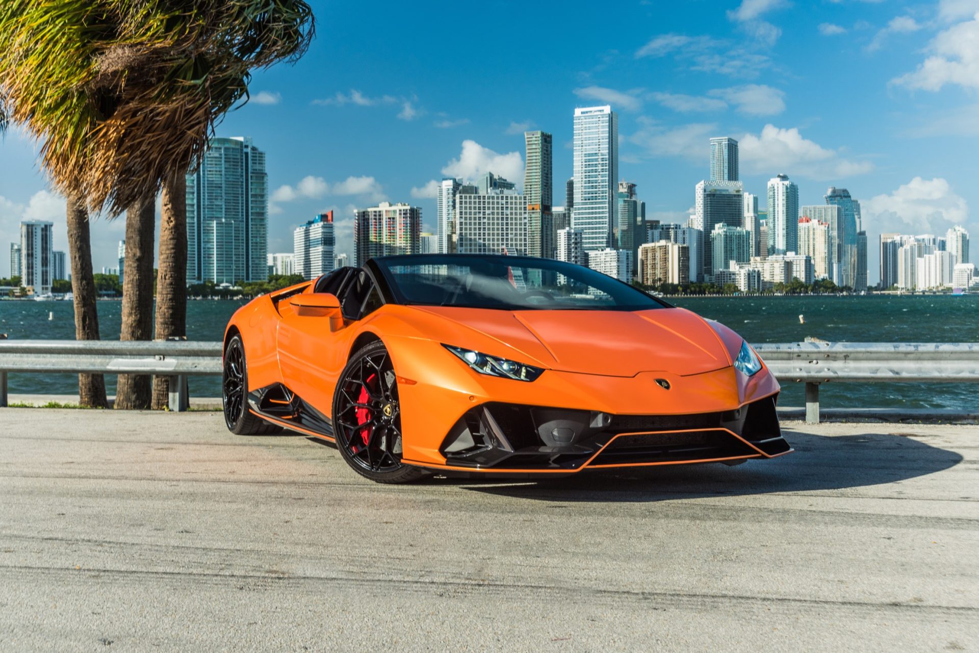 right side of Lamborghini Huracan EVO Orange for rent in Miami by Rent & Paradise Exotic & Luxury Car Rental