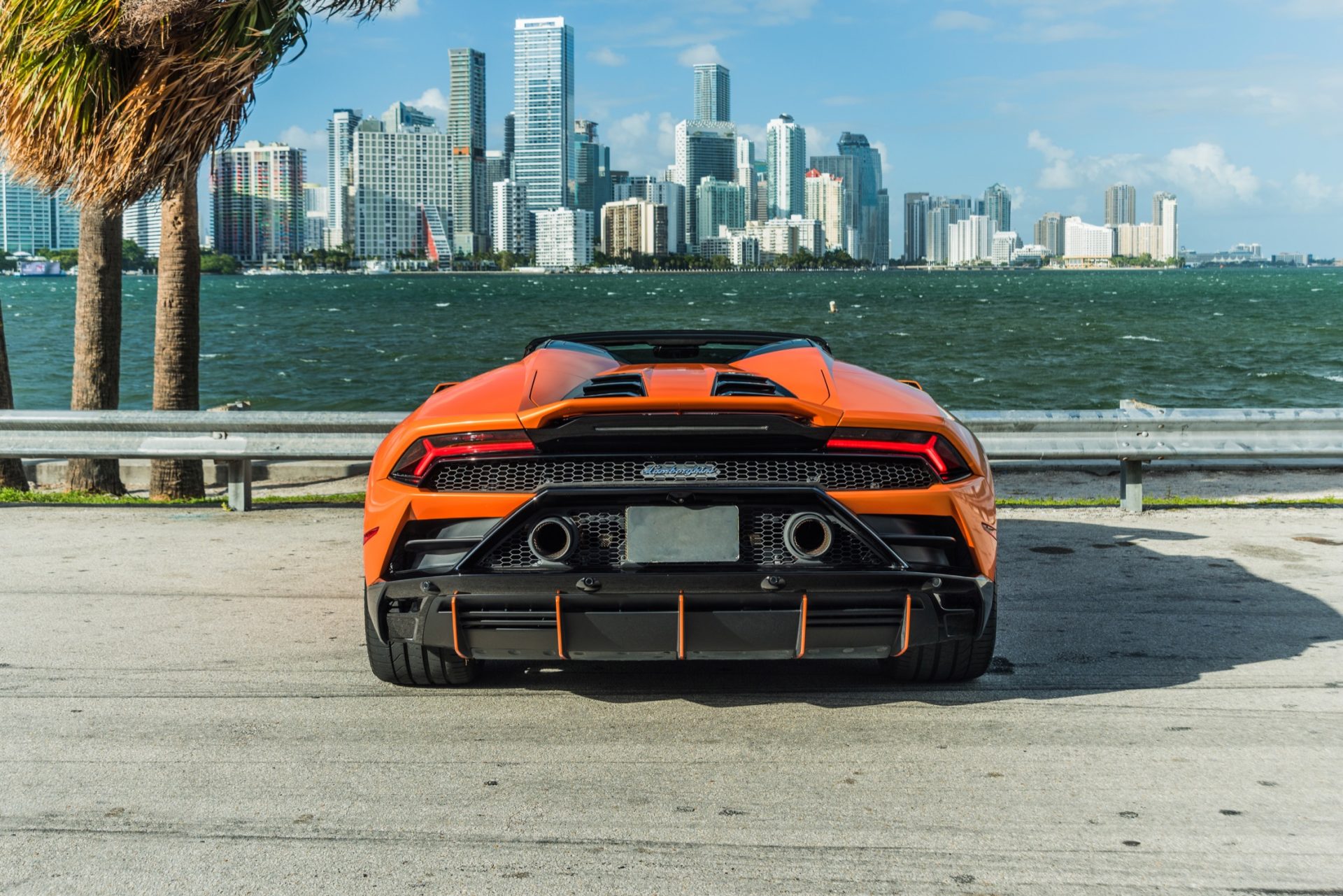 back side of Lamborghini Huracan EVO Orange for rent in Miami by Rent & Paradise Exotic & Luxury Car Rental