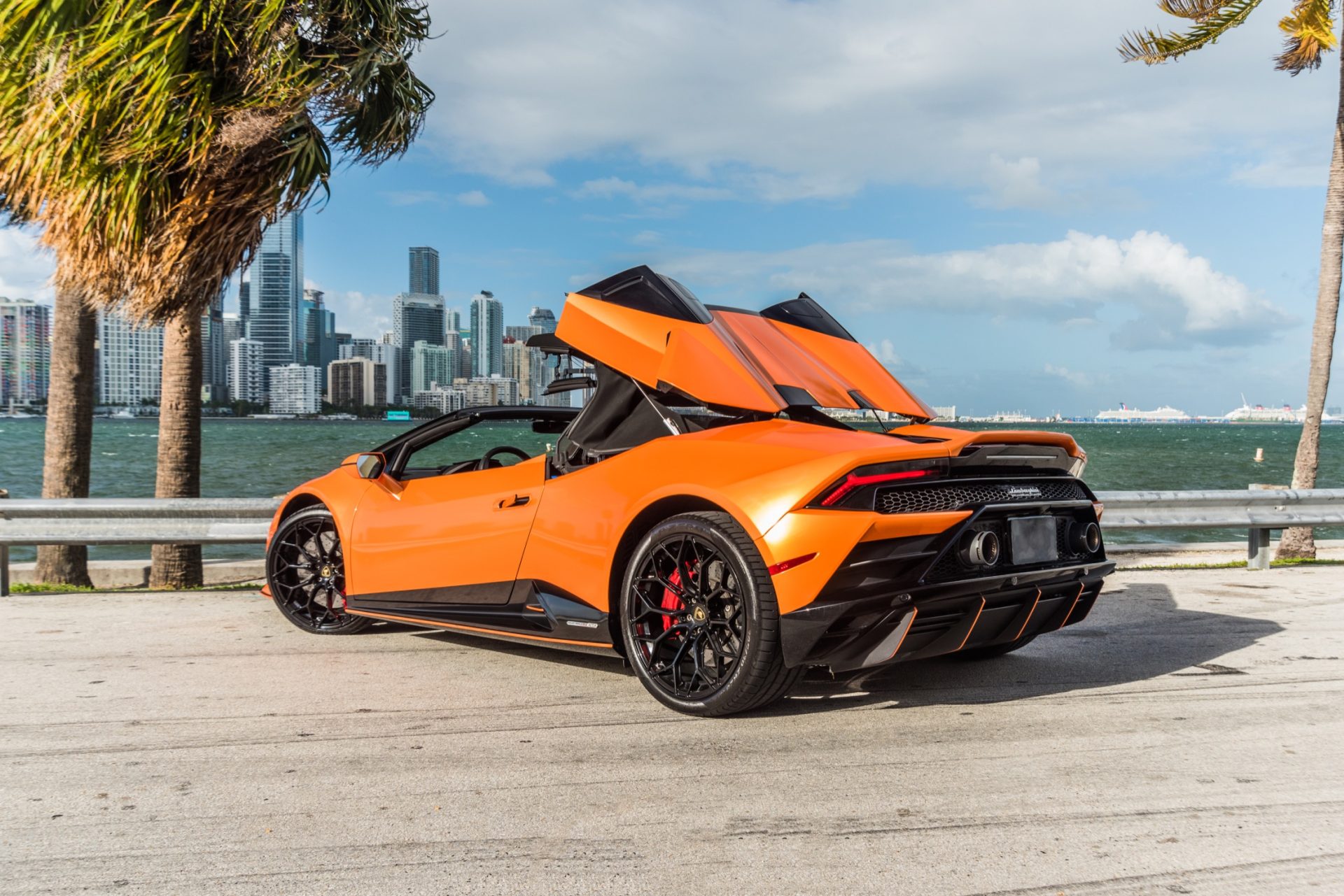 left side of Lamborghini Huracan EVO Orange thats available for rent in Miami Beach by Rent & Paradise Exotic & Luxury Car Rental