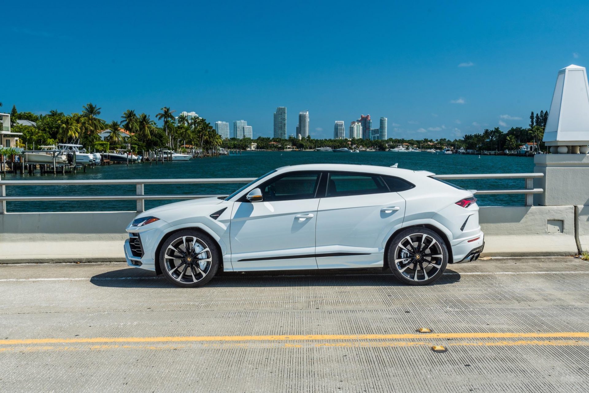 image of white Lamborghini urus rental side view