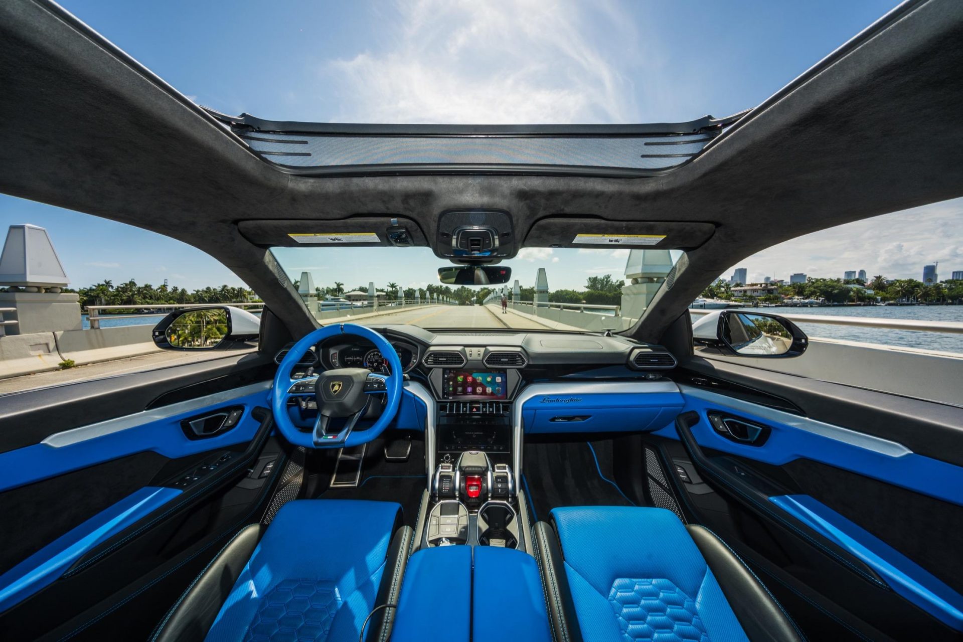white Lamborghini urus with blue front interior thats available for rent in Miami