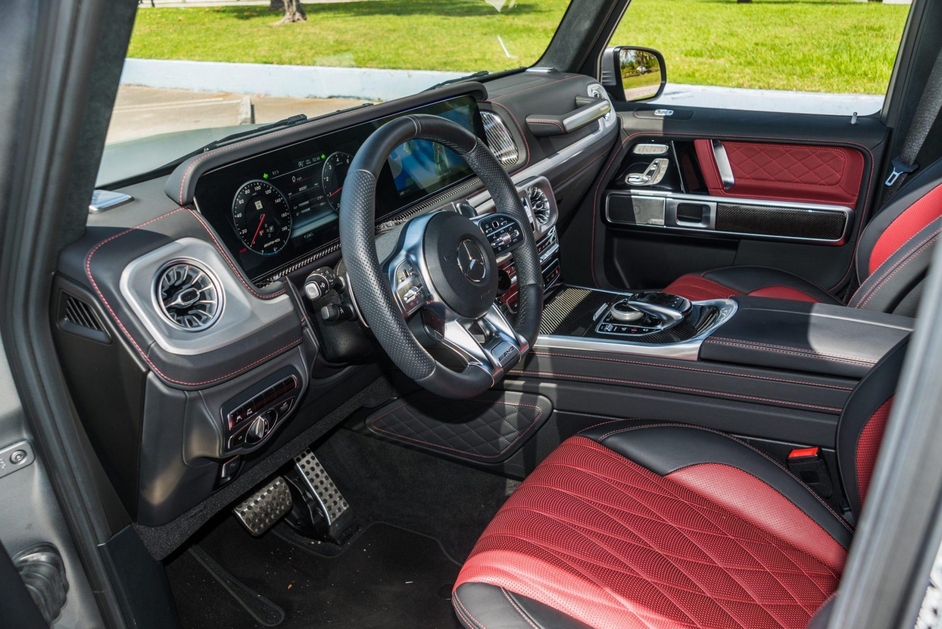silver mercedes benz g63 red driver seat